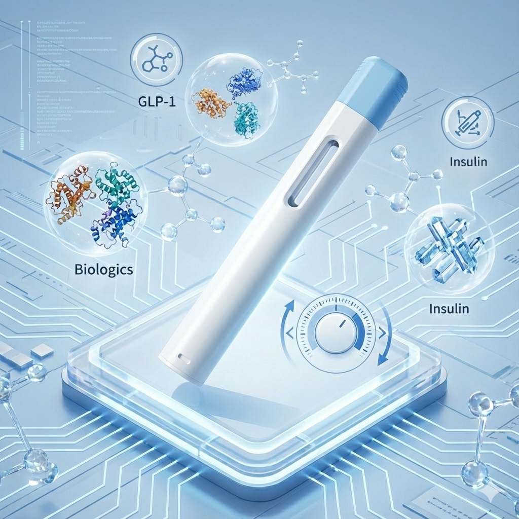 Este dispositivo es particularmente adecuado para medicamentos GLP-1, péptidos, hormonas, productos biológicos, ácido hialurónico e inyectables estéticos precargados en jeringas de 1 ml o 2,25 ml.